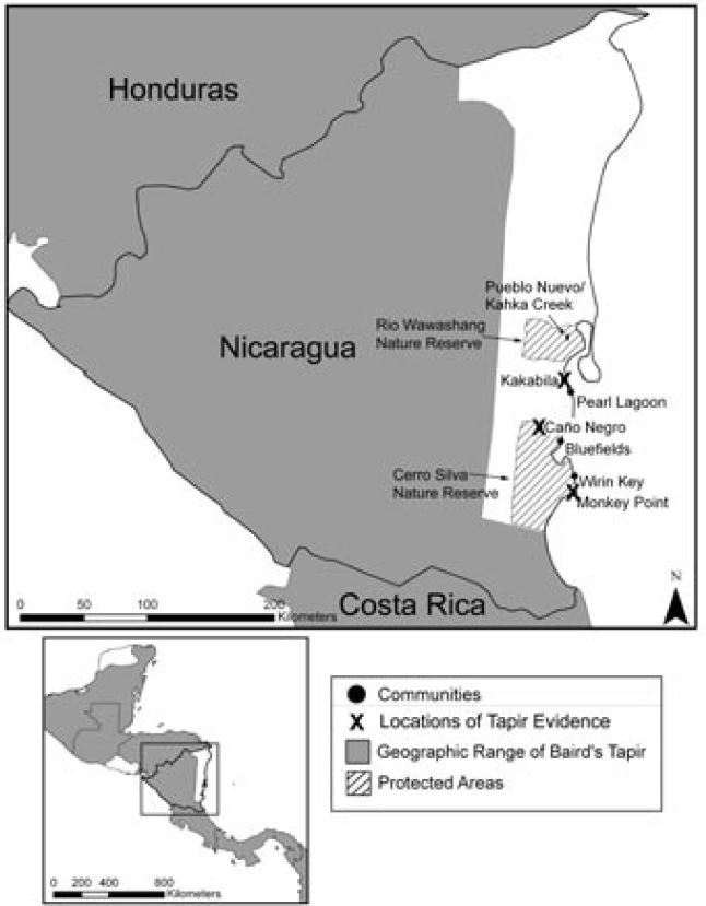 The Baird’s tapir Tapirus bairdii, acknowledged as the largest terrestrial mammal in Central and South America, is also one of the region’s rarer mammals. The species is listed as endangered on the International Union for Conservation of Nature (IUCN) Red List, is an Appendix 1 Species on the Convention on the International Trade of Endangered Species (CITES), and less than 5,500 are estimated to be left in the wild. Further, it is expected that local overhunting and habitat fragmentation will cause continued declines in remaining populations of the Baird’s tapir. Although Baird’s tapirs were believed absent or extirpated from the Caribbean coastal forests of Nicaragua, we obtained evidence from camera traps and tracks along with local accounts that demonstrate its occurrence at multiple locations in the region. More rigorous tapir surveys will help elucidate if the tapir population of the Southern Atlantic Autonomous Region (RAAS) of Nicaragua is viable or is merely comprised of dispersing juveniles and not sustainable. Such data will have significant conservation implications for an area undergoing rapid land-use and land-cover changes due to expanding agriculture and increasing investments in infrastructure.